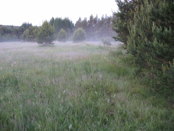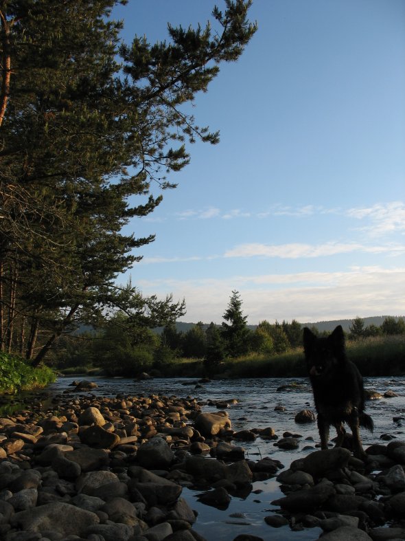 Vstávali jsme již v půl páté, abychom se vyhnuli rannímu náporu komárů. To akorát začala padat mlha na blata. V místech, kde jsme překračovali řeku, byly čertvé stopy vysoké, má v těch místech pozvolný přístup k vodě a chodí se tam napájet. Měli jsme před sebou téměř 40 km a ve dvě nám jel vlak z Nemilkova. Nakonec jsme museli chvátat, abychom ho stihli. Giri byla uťapkaná a cestu vlakem prospala pod sedačkama. Druhý den ráno jsme z ní odrolili bahno a vyrazili na výstavu. Pan rozhodčí chválil šampón, který používáme. Je vidět, že šumavskou rašelinou se nic zkazit nedá :-).