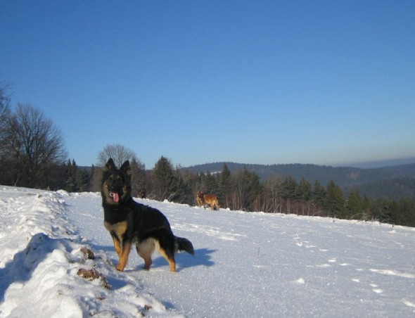 A do třetice jsme dnes, 2. 1. 09, vyrazili na běžky. Byla to psí dámská jízda ve složení Giri, Ištar, Kerča. Jarce s Lenkou by fyzičku mohl závidět kdejaký chlap. Nasazeným tempem nás zcela odrovnaly a po 25 km si připadáme jak po 50-ti. Výlet byl ale parádní a doufáme, že nás příště vezmou s sebou zase.